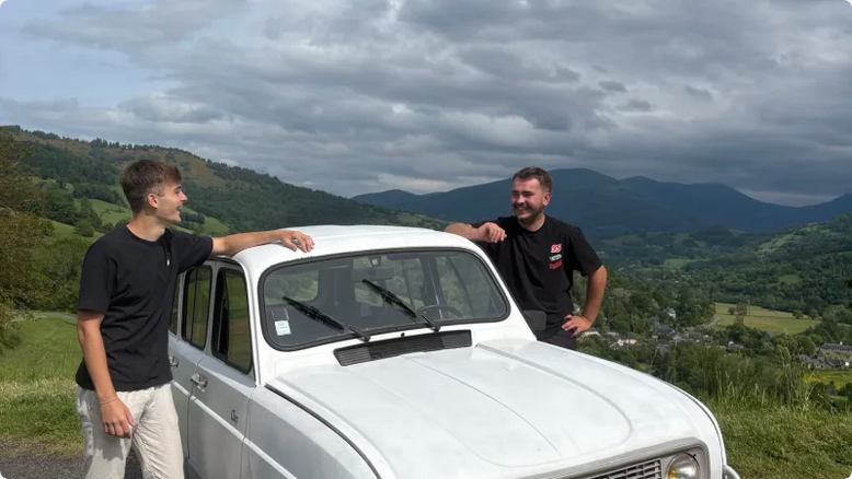 A bord de leur voiture Renault 4L blanche, Mathieu et Pierre composeront l'équipage n°894 de l'association CAP SUD ARIEGE au départ de Biarritz.